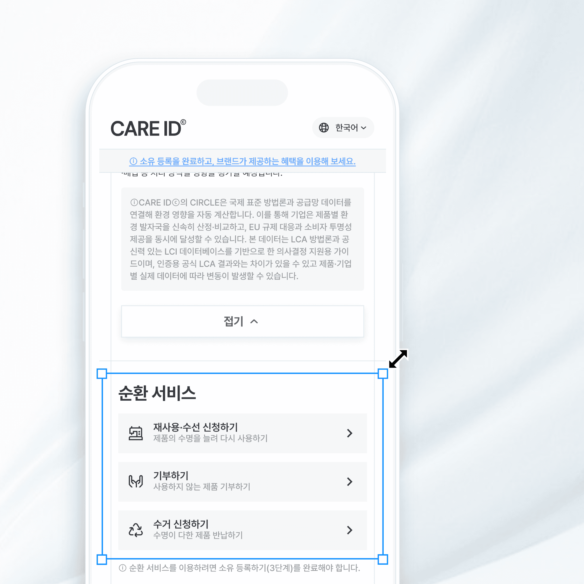 CARE ID는 브랜드의 아이덴티티와 특성에 꼭 맞는 디자인과 전용 도메인을 통해 고객에게 자연스럽고 일관된 경험을 제공합니다. QR 코드 스캔부터 디지털 제품 여권(DPP) 페이지 방문까지 모든 과정에서 브랜드의 고유한 느낌을 유지함으로써 소비자가 브랜드에 더욱 친밀감을 느끼게 되고, 이는 자사몰 방문 증가와 구매 전환율 상승으로 연결됩니다. 소비자는 브랜드의 QR코드를 스캔하면서도 오롯이 브랜드만의 경험을 느끼게 되며, CARE ID의 기술적 지원은 브랜드 뒤에서 투명하게 이루어져, 소비자가 혼란 없이 매끄럽고 일체감 있는 디지털 경험을 누릴 수 있도록 합니다.