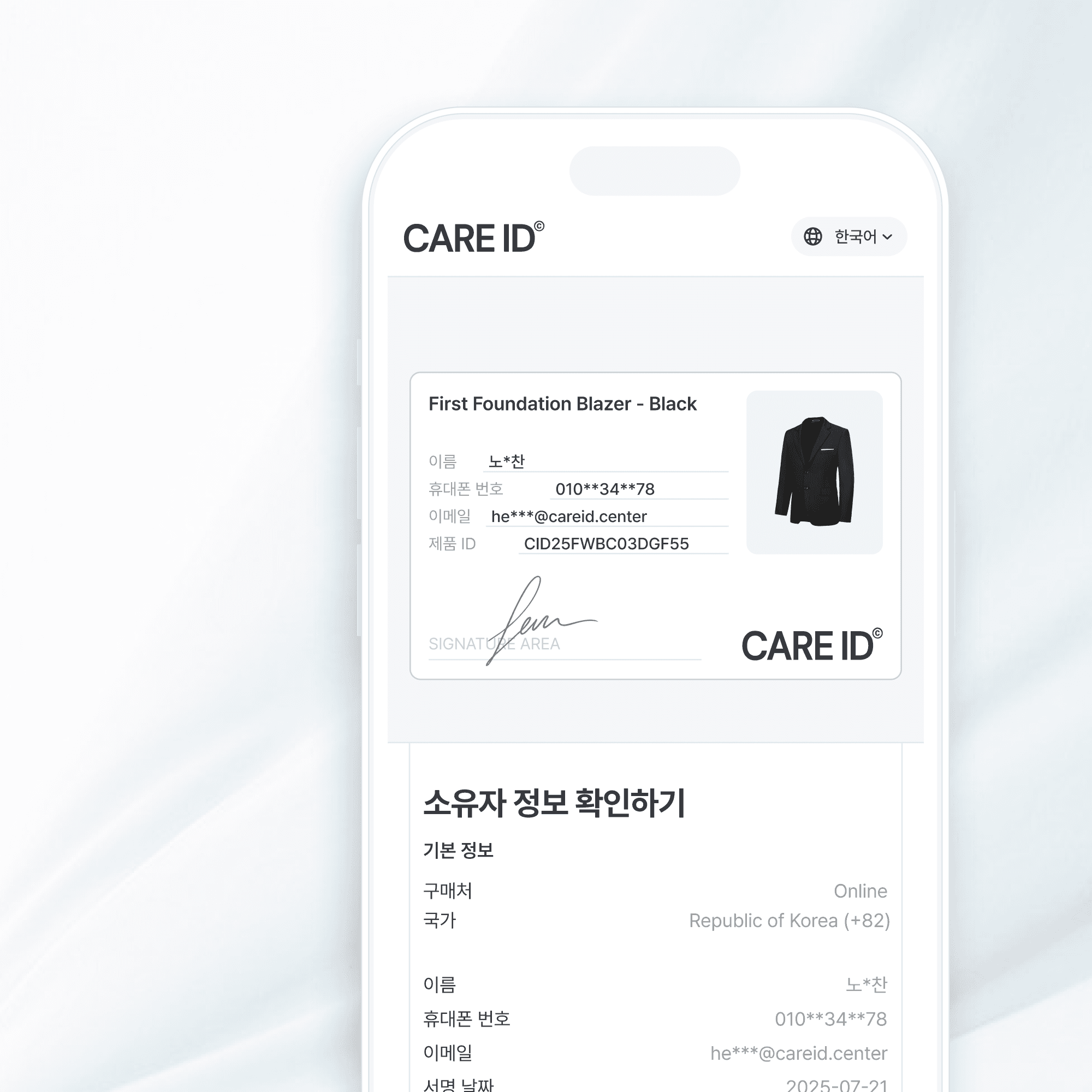 CARE ID는 가변 QR코드를 활용한 강력한 위변조 방지 정품인증 솔루션으로, 소비자가 QR코드를 스캔하면 즉시 웹사이트로 연결되어 구매 영수증 인증과 개인 서명을 통해 제품과 1:1로 매칭되는 구조를 제공합니다. 이 프로세스가 한 번 완료되면, 동일한 QR코드를 복제하거나 여러 장 출력해 가품을 유통하려고 시도해도 최초 인증된 정품 외에는 모두 가품으로 판정되어 효력을 잃게 됩니다. 이러한 CARE ID만의 독창적인 인증 구조 덕분에 소비자와 브랜드 모두 제품의 진위 여부를 빠르고 정확하게 확인할 수 있으며, 가품 유통을 근본적으로 방지하여 브랜드의 신뢰와 소비자의 안심을 완벽히 보호합니다.
