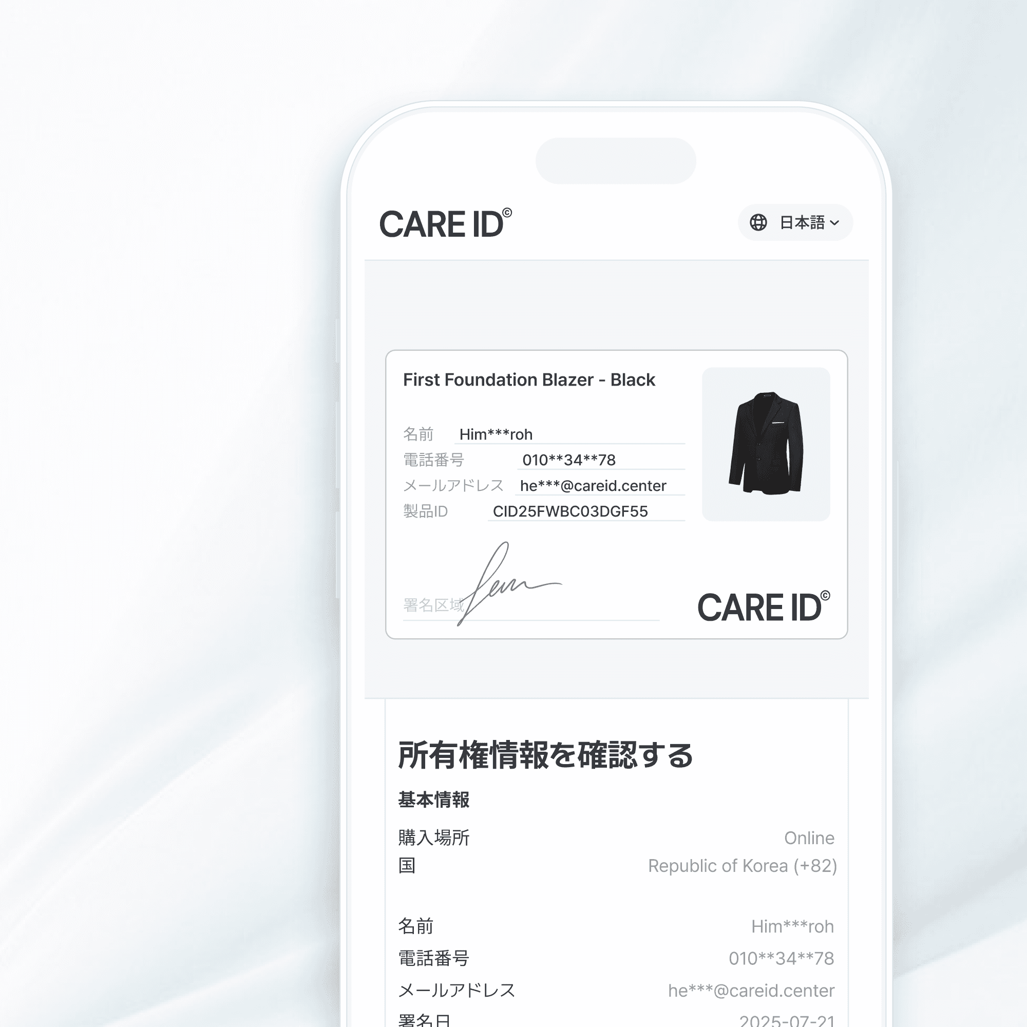 CARE IDは可変QRコードを利用した強力な偽造防止正品認証ソリューションであり、消費者がQRコードをスキャンすると即座にウェブサイトに接続され、購入レシート認証と個人署名を通じて製品と1:1でマッチングされる構造を提供します。このプロセスが一度完了すると、同じQRコードを複製したり、複数印刷して偽物を流通させようとしても、最初に認証された正品以外はすべて偽物として判定され、その効力を失います。このようなCARE ID独自の認証構造のおかげで、消費者とブランドの両方が製品の真偽を迅速かつ正確に確認でき、偽物の流通を根本的に防ぎ、ブランドの信頼と消費者の安心を完全に保護します。