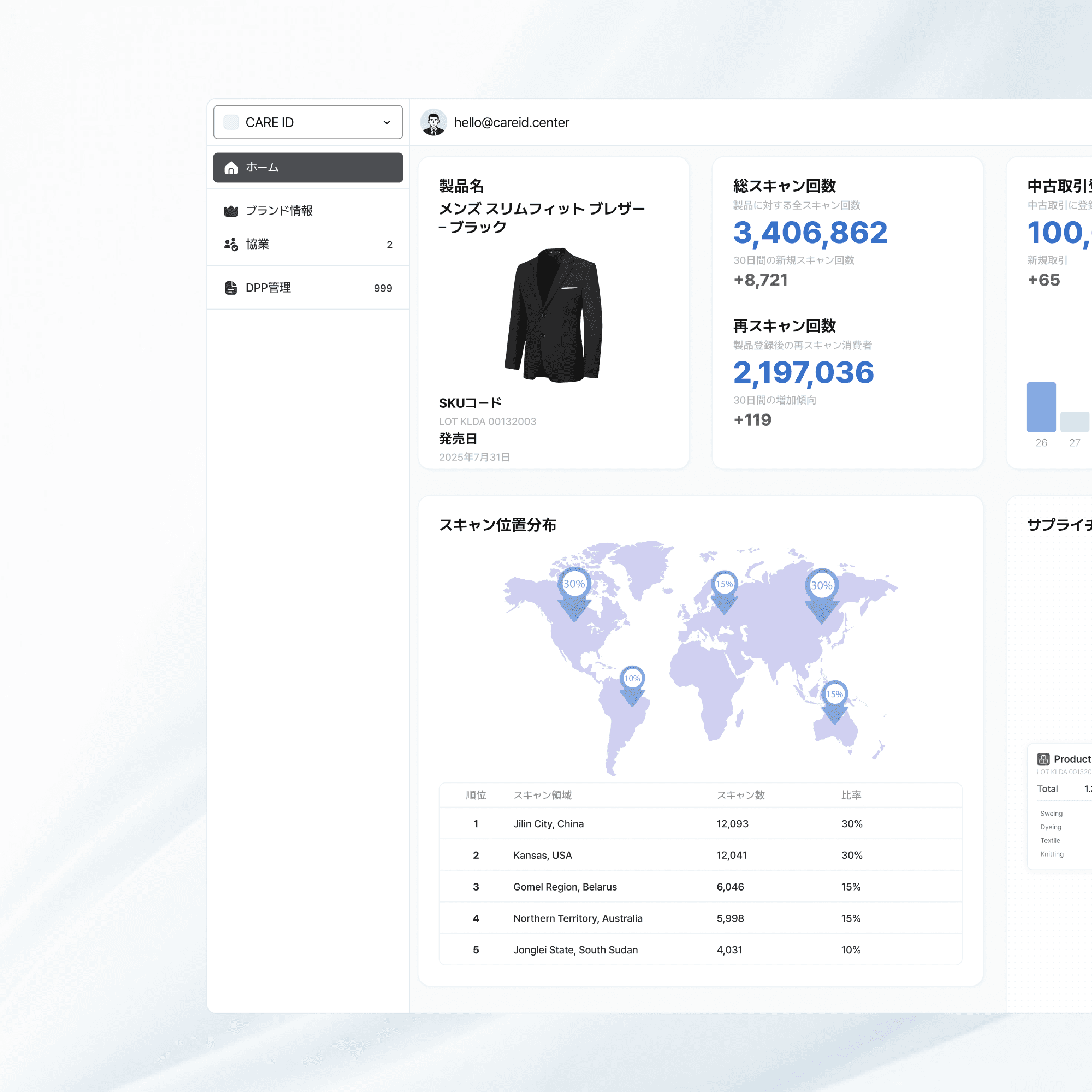 CARE IDは、ブランドが顧客の購入、転売、修理など製品に関連するデータを直感的に分析できるよう支援します。毎月発行されるデジタル製品パスポート(DPP)の比率から、中古取引量、アフターサービスの受理件数、廃棄状況まで、ブランドが気になるすべての指標を月単位で整理して提供します。また、個々の製品ごとにユーザーの1対1の正規認証署名数やそれに基づく消費者の年代などの人口統計データを提供することで、ブランドは顧客をより深く理解し、マーケティング戦略を効果的に立てることができます。正確なデータ分析を通じて、ブランドはより良い顧客体験を設計でき、長期的には顧客の忠誠心を高めることができます。